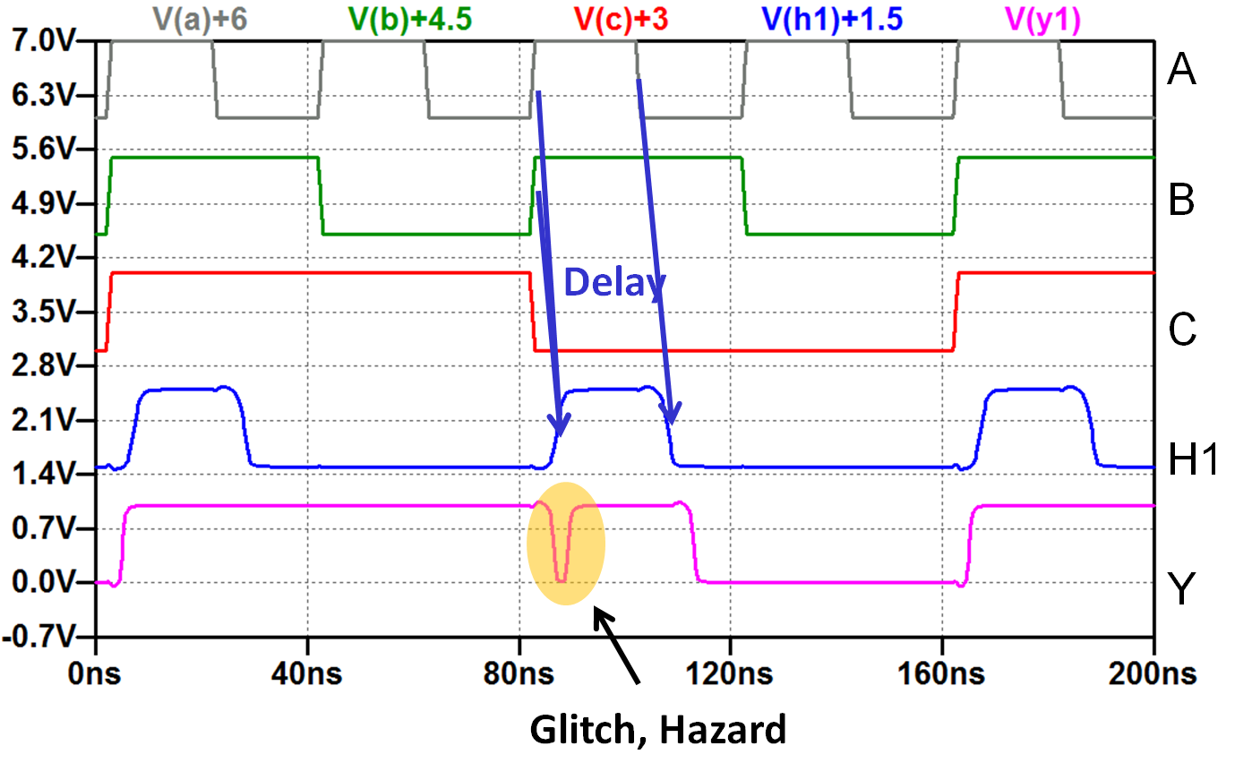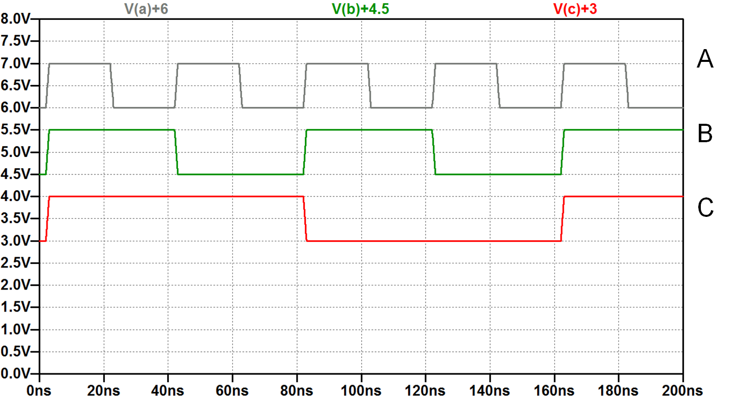 Zeichnen Sie die Zeitfunktion mit einer Verzögerungszeit von 5ns. Folgender Zeitverlauf der Eingangssignale ist gegeben. |
