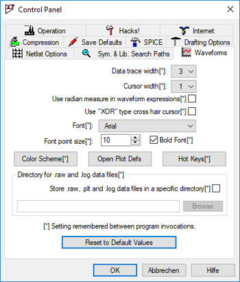 Anzeige von Mittelwert und Effektivwert Die Legende der Kurve im Waveformfenster anwählen. < strg > Maus Linksclick Messungen von Zeiten .Measure TAX00 WHEN V(ax)=0.5 FALL=1 .Measure TY101 WHEN V(y1)=0.5 RISE=1 .Measure DY101 PARAM (TY101-TAX00)*1E12 Name des Ergebnisses TAX00 Spannung vom Knoten ax von 0.5V bei einer fallenden Flanke |