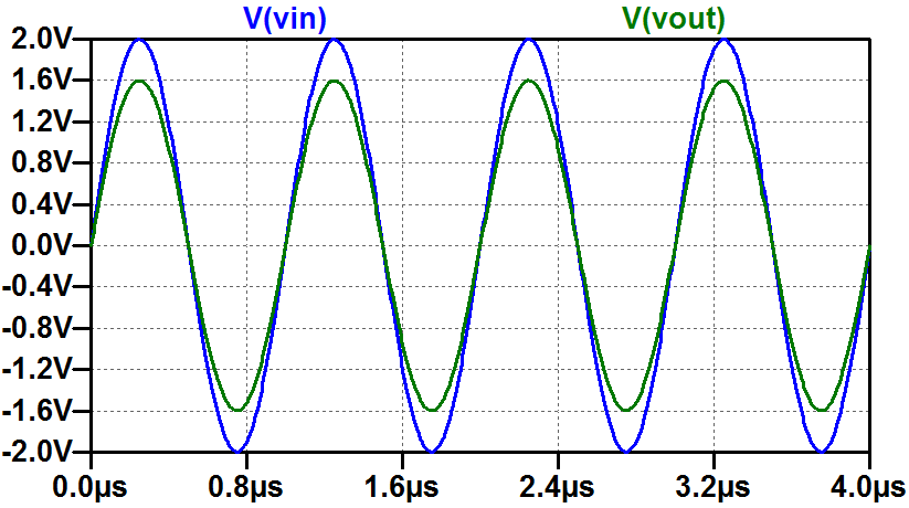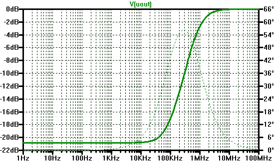 \( \frac{U_{out}}{U_E} = \frac{R2 + j \omega L1}{R1 + R2 + j \omega L1}\) R1 = 80 Ω R2 = 8 Ω L1 = 15 µH AC Simulation: Spannungsquelle: AC 1 Simulation .AC |