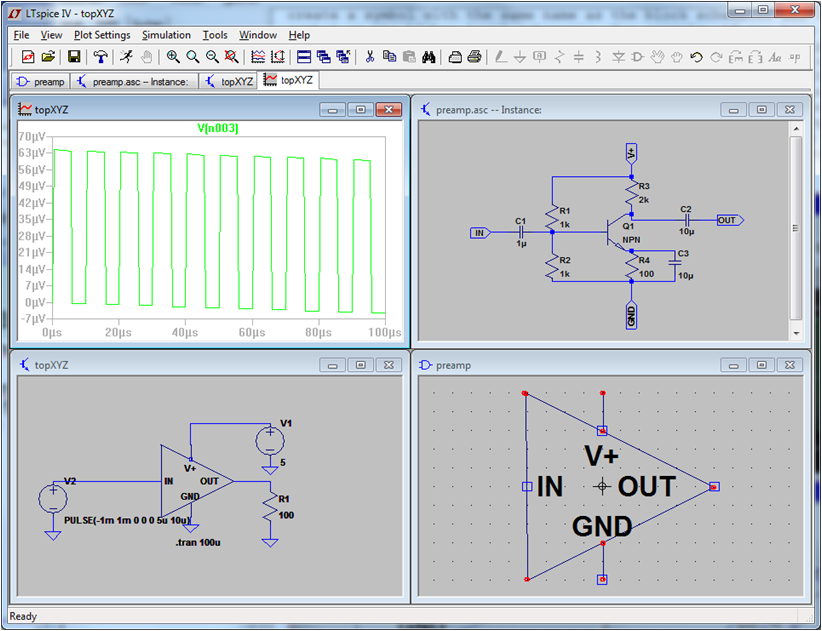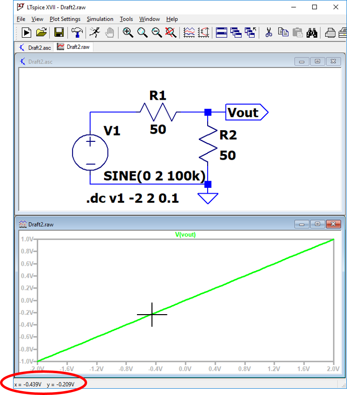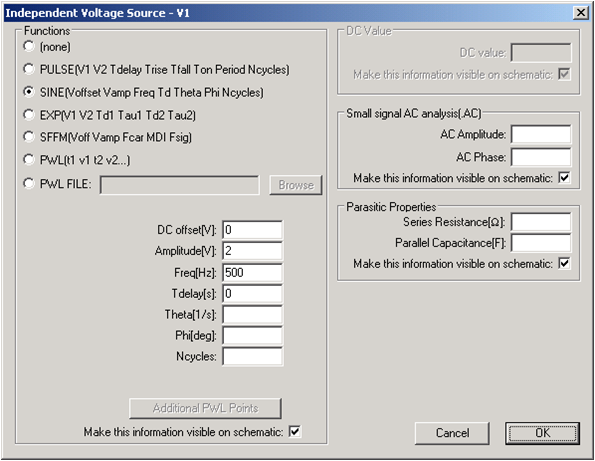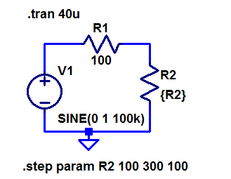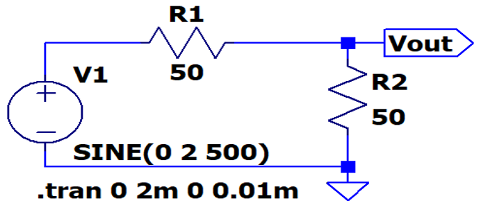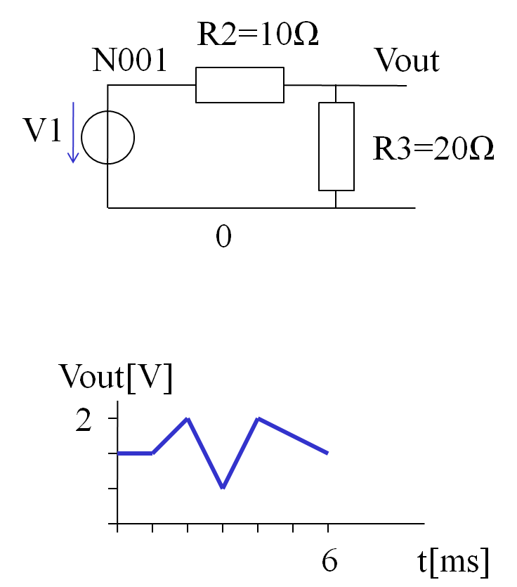![]() Knoten N001, 0 (Masse, Unten), Vout Quellen links zeichnen, Ausgänge rechts PWL Zeichnen Vout = V1/30Ohm · 20 Ohm = 2/3 V1 |