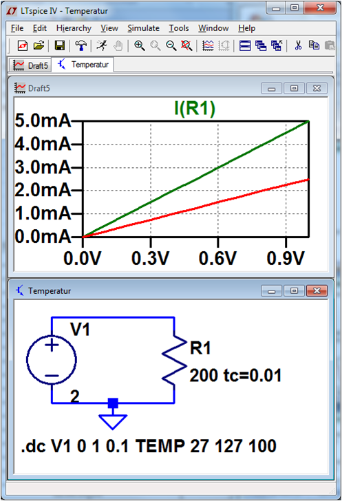 R1 N001 0 200 tc=0.01 V1 N001 0 2 .dc v1 0 1 0.1 TEMP 27 127 100 .end Die Spannungsquelle V1 wird variiert Die Temperatur wird variiert. Ist das Ergebnis sinnvoll? Eine Temperaturänderung von 100K bewirkt eine Widerstandsänderung mit dem Faktor 2. |