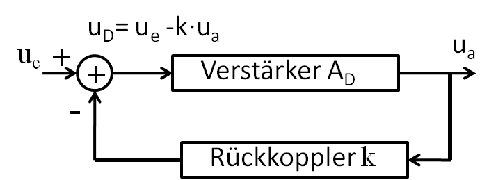 ![]() \( u_a = A_D \left( u_e - k \cdot u_a \right) \) \( u_a \left( 1 + A_D \cdot k \right) = A_D \cdot u_e \) \( \frac{u_a}{u_e} = \frac{A_D}{1+A_D \cdot k} = \frac{1}{\frac{1}{A_D}+ k} \) \( A = \frac{u_a}{u_e} \approx \frac{1}{k} \) |