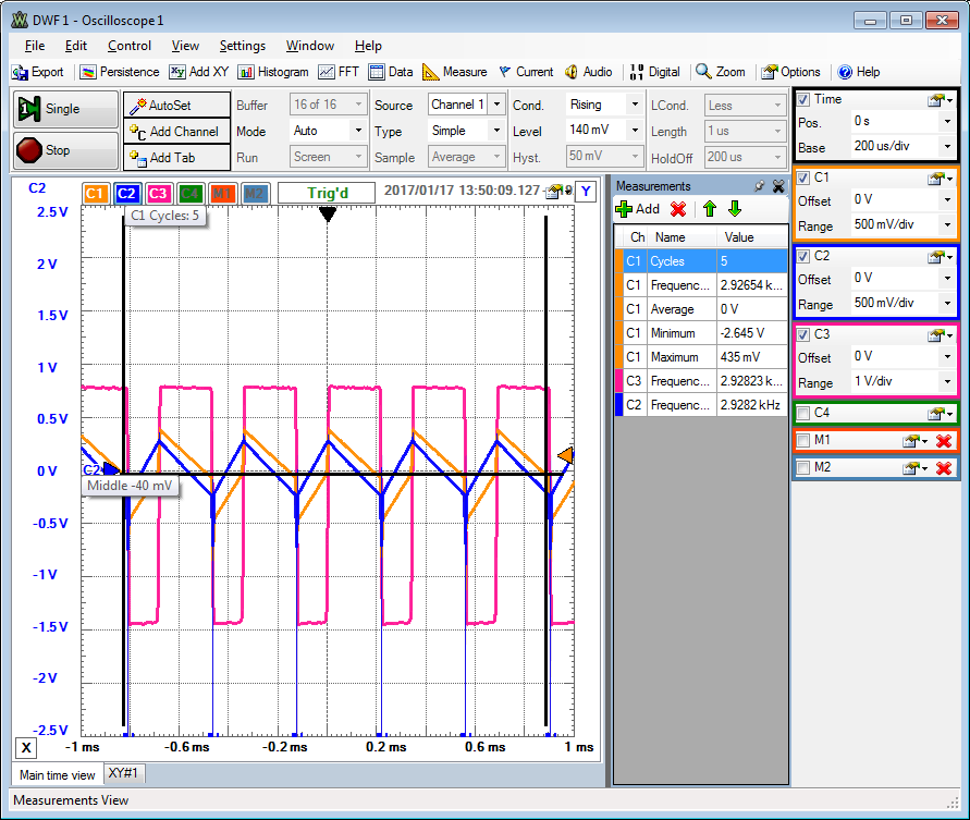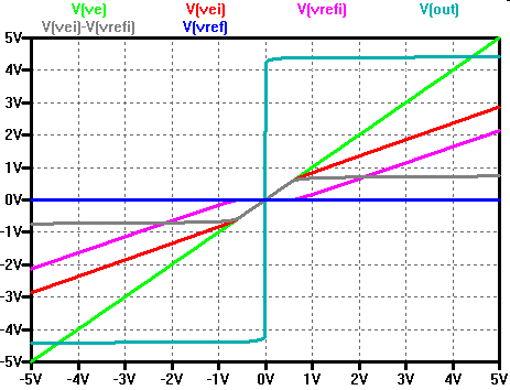 Realer Operationsverstärker \( U_{amax}, U_{amin} \) LTSPICE: DC Simulation zeigt keine Hysterese Transiente Simulation LTSPICE Mausklick auf x - Achse: V(ve) Hysterese: \( U_H = \left( U_{amax} - U_{amin} \right) \frac{R_1}{R_2} \) \( U_H = \left( 14 V - (- 14 V) \right) \frac{1 k\Omega}{10k\Omega} = 2.8 V \) Oszilloskopmessung: x-y Betrieb |