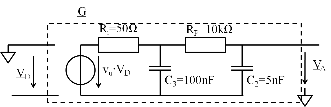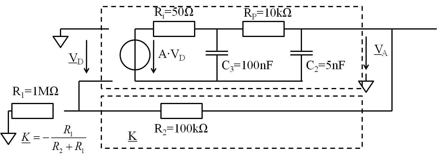 Zeichnen Sie das Modell der Gegenkopplung und berechnen Sie K und G. Nehmen Sie die Tiefpässe als Rückwirkungsfrei an. Bestimmen Sie die Grenzfrequenzen. Ist die Schaltung stabil? ![]() |