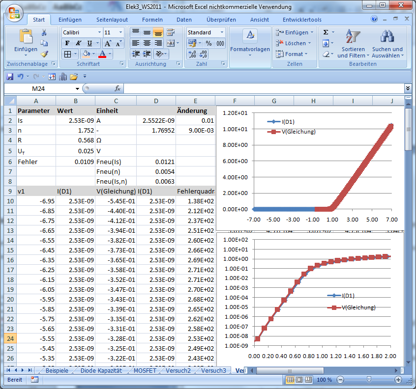 Analog zu Versuch 1 gibt es ein Blatt in Excel mit den Modellparametern der Diode,