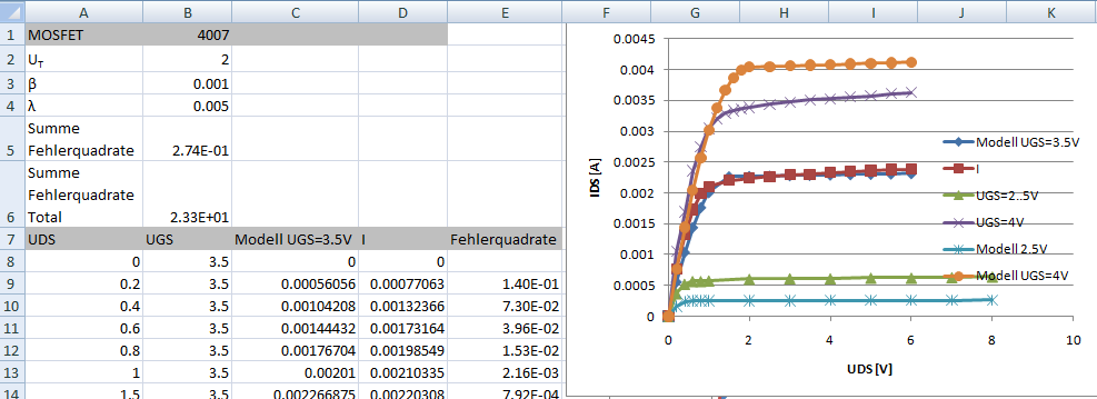 Die Parameter Uth, \( \beta \) und \( \lambda \) der Transistorgleichung können eingegeben werden, UDS und UGS werden aus den Spalten A und B verwendet und der entsprechende Strom wird in Spalte D nach der MOSFET Transistorgleichung berechnet.