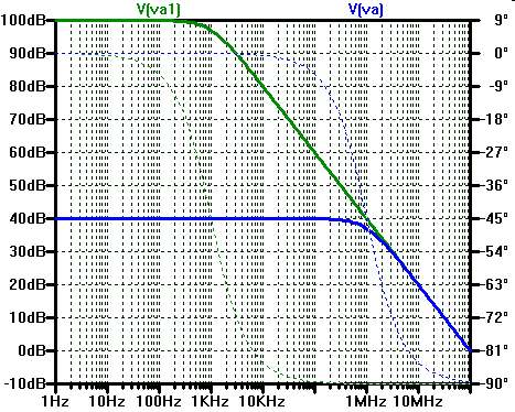 \( f_g = \frac{f_t}{u_{D0}} = \frac{100 MHz}{10^{\frac{100 dB}{20 dB}}} = 1 kHz \) \( \frac{U_a}{U_e} = \frac{R_1 + R_2}{R_2} \) \( \frac{U_a}{U_e} = 10^{\frac{A_u}{20 dB}} = 10^{\frac{40 dB}{20 dB}} = 100 \) \( \frac{R_1 + R_2}{R_2} = 100 \) \( R_1 = 99 \cdot R_2 \) Der Widerstand sollte nicht zu groß (Toleranz, Leckstrom) und nicht zu klein (Leistung) werden. \( R_1 = 99 k\Omega ; R_2 = 1 k\Omega \) \( f_{g1} = \frac{f_t}{u_{D0}} = \frac{100 MHz}{10^{\frac{40 dB}{20 dB}}} = 1 MHz \) ![]() |