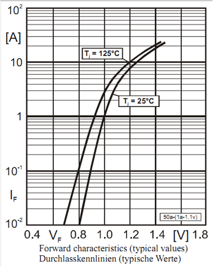 Sperrstrom und Durchlassstrom steigen mit der Temperatur. \( I_D = I_S \left( e^{\frac{U}{nU_T}} -1 \right) \) \( I_S \sim n_i^2 =B·T^3·exp^{-\frac{W_g}{kT}} \) \( U_T \sim T \) |