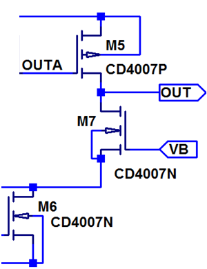 • Eine Änderung von ua bewirkt eine Änderung von der Spannung outa, die die Sourceschaltung aus M5 (Verstärker) und M7 (Last) ansteuert.
