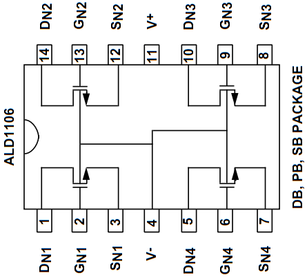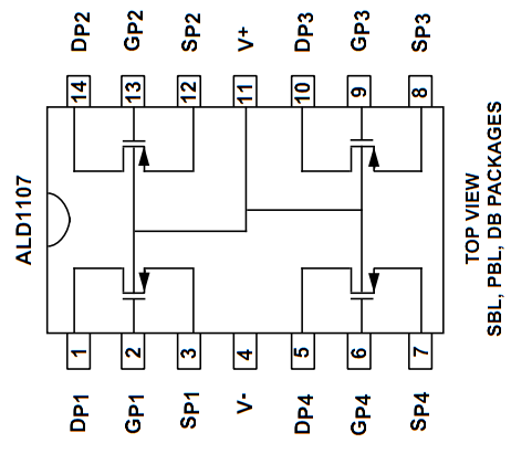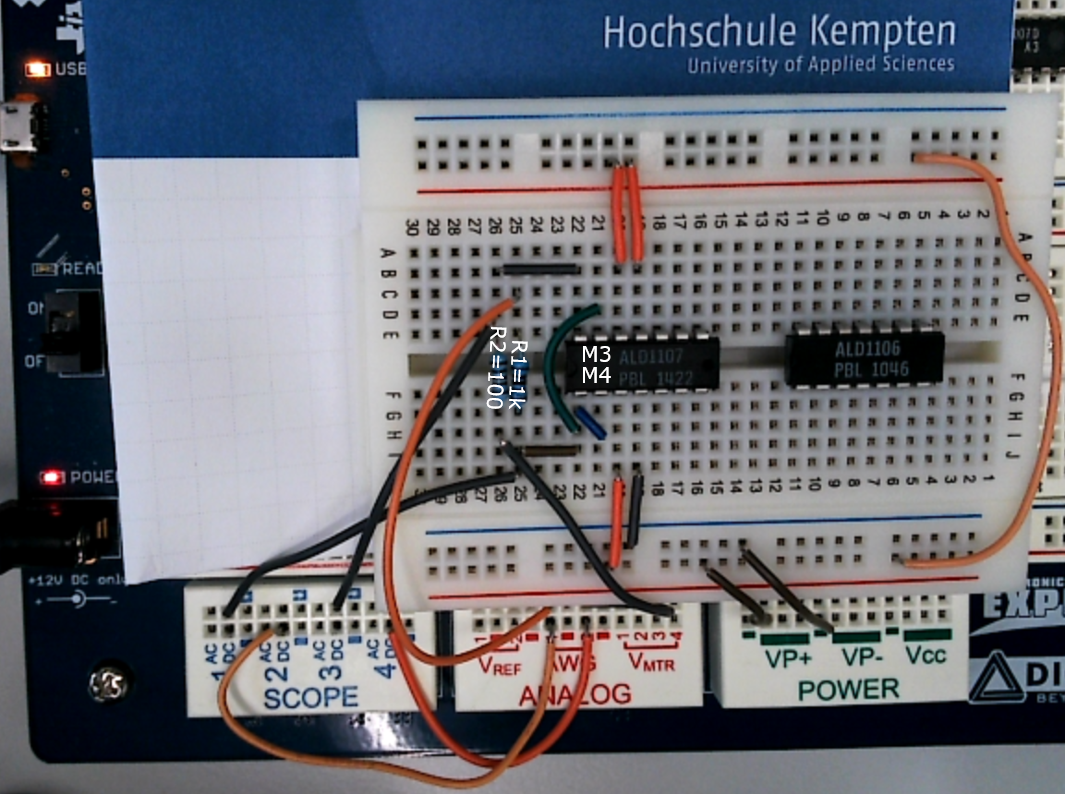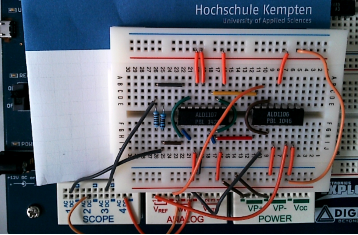 Ein PFET Array ALD1107 und NFET Array ALD1106 wird als Differenzverstärker verschaltet und mit dem Electronic Explorer betrieben.