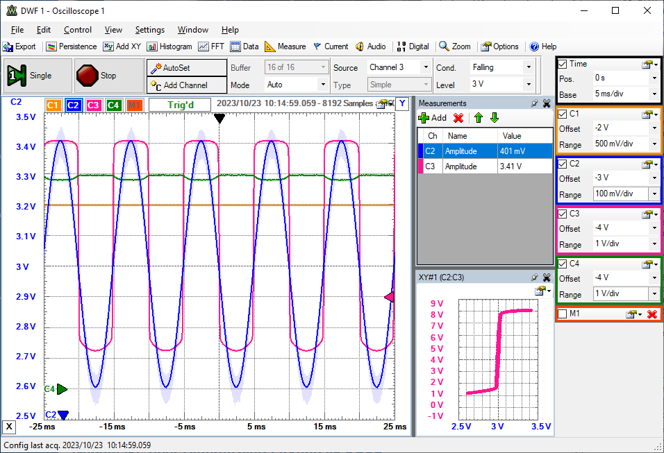 Am Oszilloskop sieht man in blau (C2) die Eingangsspannung VAWG2 mit 400 mV Amplitude, die Spannung OUTA (grün, C4) und die verstärkte Spannung OUT (pink, C3).