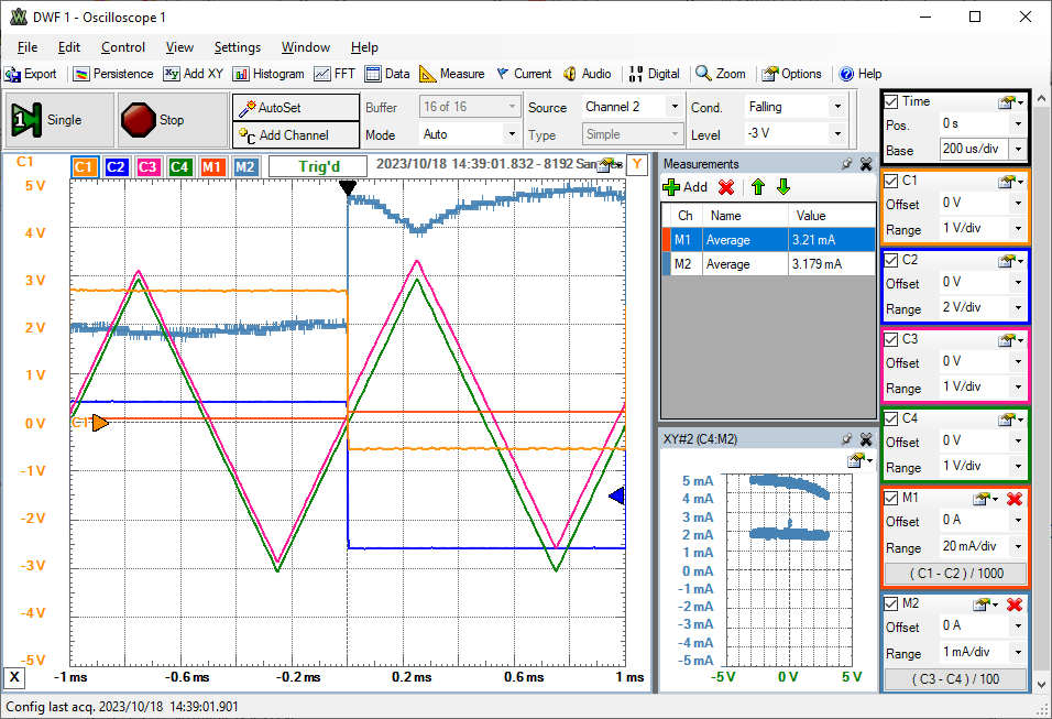 Man bestimmt mit AWG1 = 1 V, -5 V (Rechtecksignal, f = 500 Hz, Amplitude = 3 V, Offset = -2 V) den Strom I1 (M1) = 2 mA, 4.5 mA und erkennt, dass bei Variation von AWG2 (Triangle, f = 1 kHz, Amplitude = 4 V, Offset = 0 V) von -3 V bis zu +3 V sich der Strom nur wenig ändert.