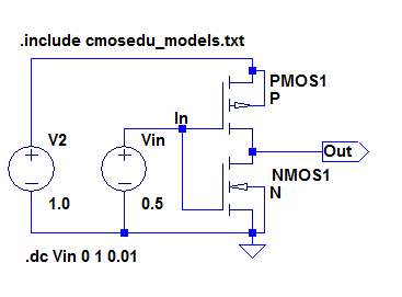In der Simulation wird die Kennlinie eines Inverters dargestellt. Bei der Simulation wird am Eingang die Spannung Vin von 0 auf 1 V verändert und die Ausgangsspannung beobachtet.