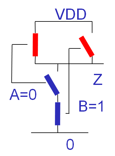 Bei einer gewählten Eingangssignalkombination wird dann verfolgt, ob der Ausgang mit VDD oder GND (0 V) verbunden ist, und sich so eine '1' oder '0' ergibt.