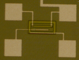 Das obere Bild zeigt eine Mikroskopaufnahme eines integrierten Widerstandes.