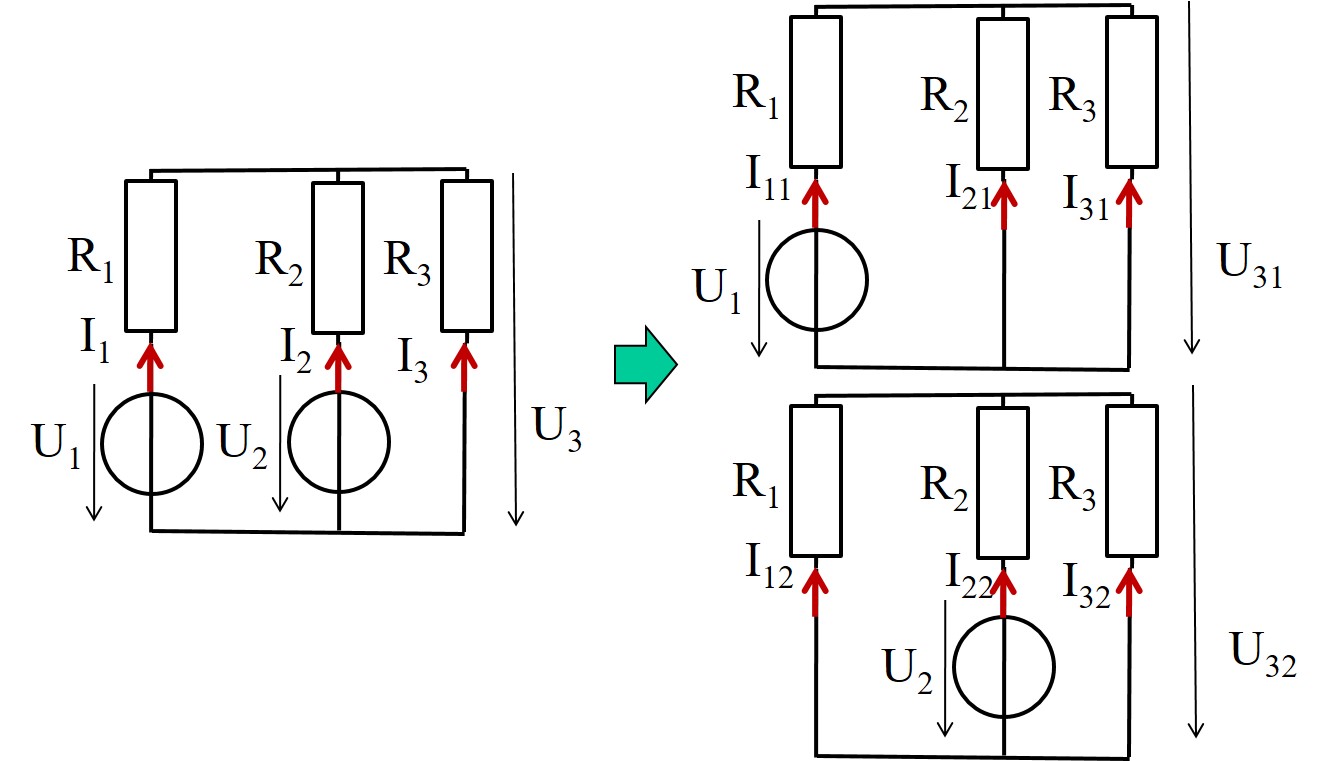 Ziel:Berechnen einer Schaltung mit nur einer Quelle. Überlagerung, Addition der Ergebnisse. |