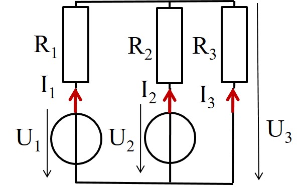 \( I_{K1} = \frac{U_1}{R_1} \) \( I_{K2} = \frac{U_2}{R_2} \) \( I = -I_3 = I_{K1} + I_{K2} = \frac{U_1}{R_1} + \frac{U_2}{R_2} \) \( U_3 = \frac{I}{\frac{1}{R_1} + \frac{1}{R_2} \frac{1}{R_3}} \) \( U_3 = - \frac{\frac{U_1}{R_1} + \frac{U_2}{R_2}} {\frac{1}{R_1} + \frac{1}{R_2} \frac{1}{R_3}} \) \( U_3 = - \frac{U_1 \cdot R_2 \cdot R_3 + U_2 \cdot R_1 \cdot R_3} {R_2 \cdot R_3 + R_1 \cdot R_3 + R_1 \cdot R_2} \) |