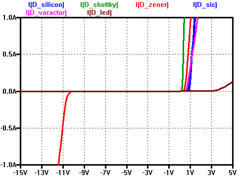 Bei der Zenerdiode sieht man bei -10 V Sperrspannung einen Durchbruch, der Strom steigt an.