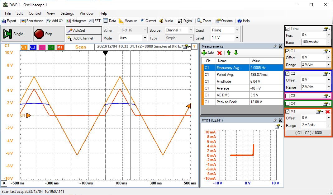 Die Diodenkennlinie kann man als xy Darstellung im kleinen Fenster sehen.