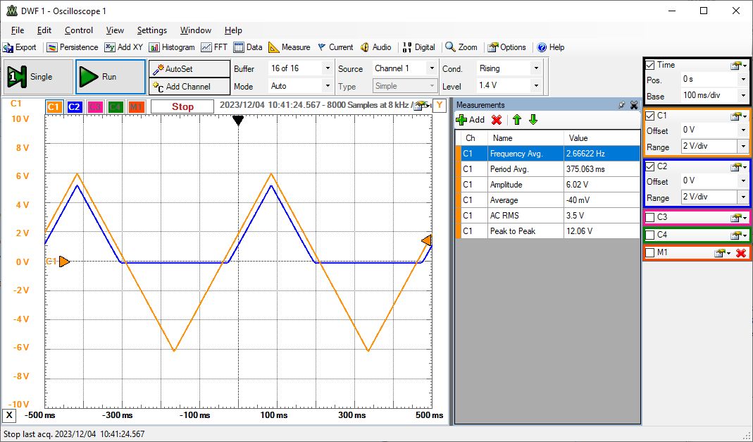 zeigt eine Dreiecksform der Spannung des Generators AWG1(C1 orange).