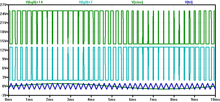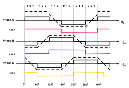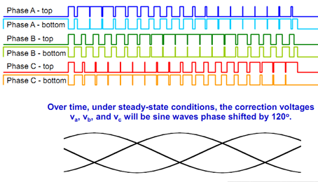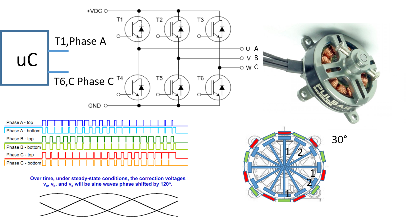Die Spannungsquellen V1, V2, V3 erzeugen die Motorsteuerungsspannungen A, B, C.