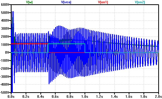 Nach 3 s wird der Motor dann mit 50 Hz Sinussignal betrieben (Spanningsquelle V8, on2).