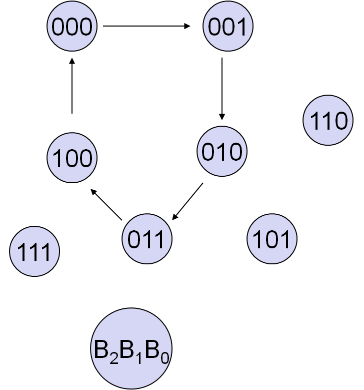 3 Speicherzellen 8 Zustände 5 Zustände werden benutzt. Kein Signal an den Pfeilen, da die Zustandsänderung auf jeden Fall durchgeführt wird. |