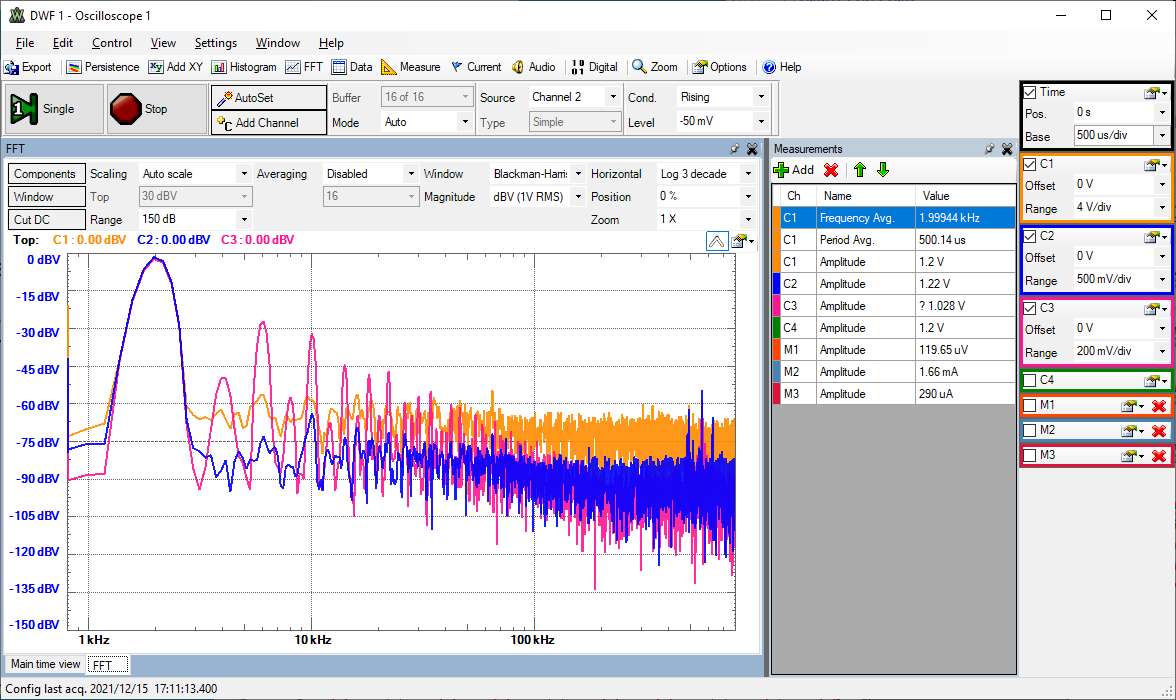 Wird das Sinussignal sehr klein dargestellt (C1 gelbe Kurve), verliert man Genauigkeit bei den Messwerten und in der FFT steigt der Rauschpegel.