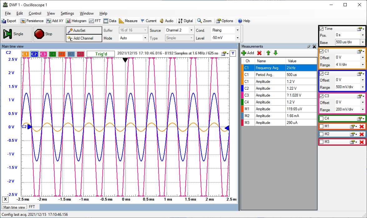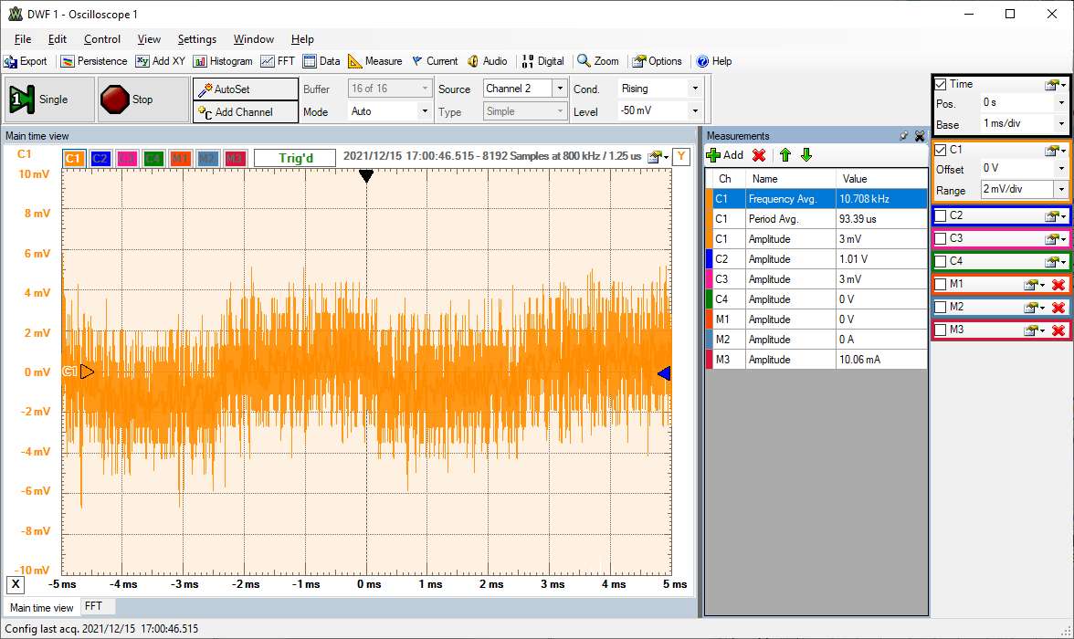 Messzeit: 5 ms mit erfassten 8000 Messpunkten von denen bei der Bildschirmauflösung maximal 1920 dargestellt werden können.