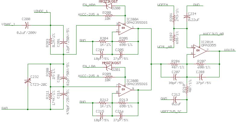 Man sieht die Schaltungstopologie, typische Operationsverstärker (OPA2355, OPA3355) und ihre Beschaltung. Auch Bufferkapazitäten für die Stabilisierung der Spannung der Bauelemente sind vorhanden. Auf der Platine werden im Aufdruck Signalnamen und Bauteilbezeichnungen (IC200A) dargestellt.