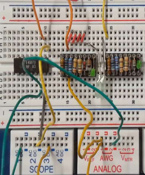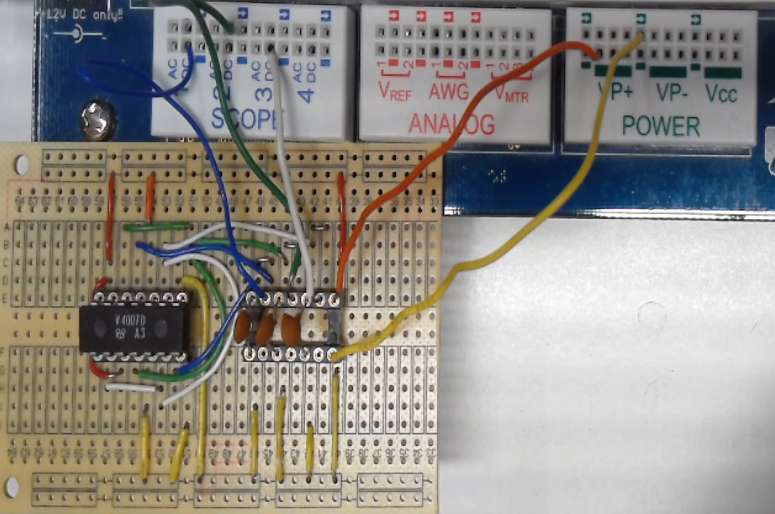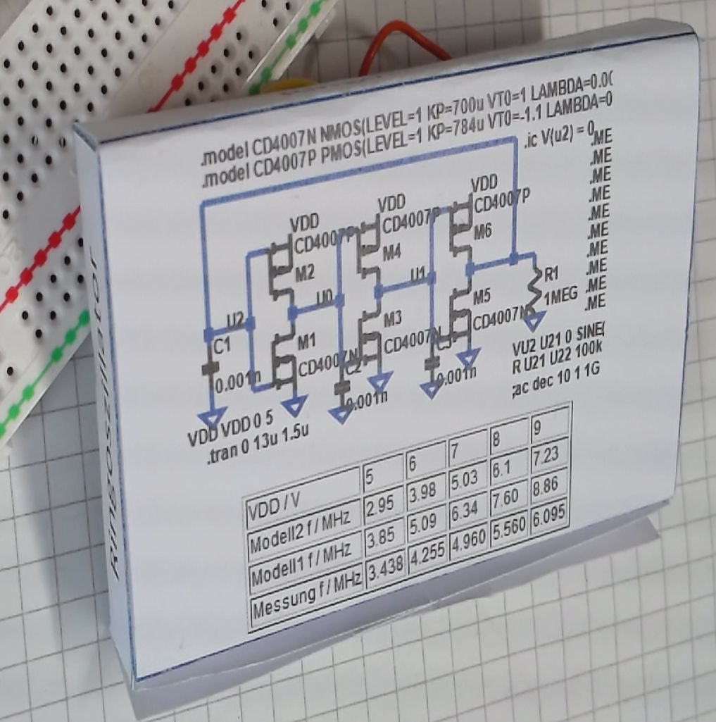 Mit einem CD4007 Baustein wurde ein Ringoszillator für 5V Betriebsspannung und 1 MHz Frequenz entwickelt.