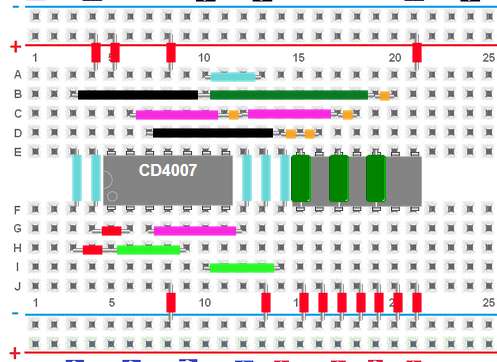 Hier wurde der Baustein CD4007 ausgewählt, da er viele Einsatzmöglichkeiten hat,