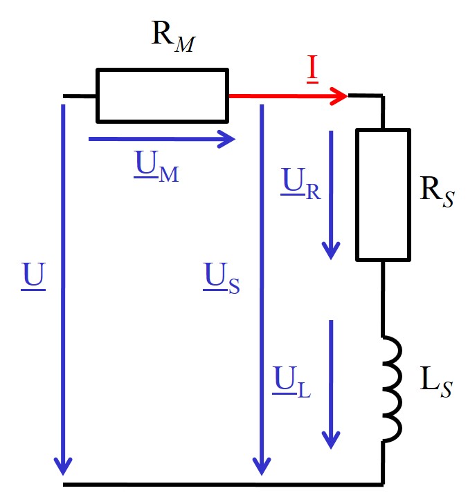 RM an Sinusspannung betrieben. Die Effektivwerte der Spannungen U, UM und Us werden gemessen; damit kann man die gesuchten Größen RS und LS berechnen. Name des Verfahrens: Messung von 3 Spannungen |