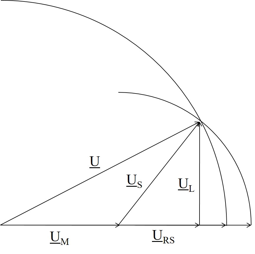 Man trägt \( \underline{U}_M \) auf der realen Achse auf. Am Endpunkt trägt man einen Kreis mit dem Radius US auf. Mit einem 2ten Kreis vom Anfangspunkt von UM und Radius U findet man den Schnittpunkt der 2 Kreise. Daraus ergibt sich UL und URS ![]() |