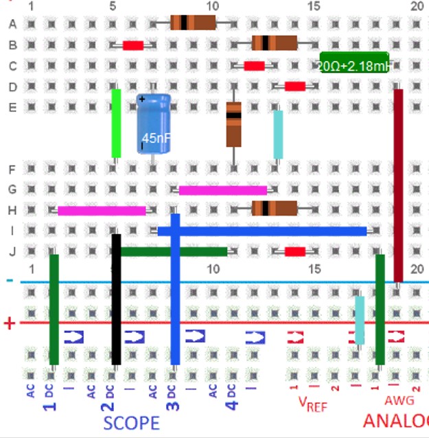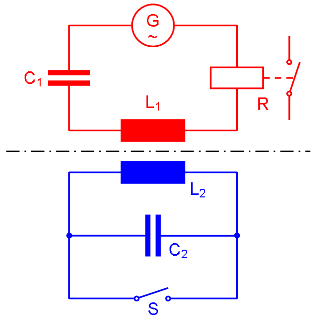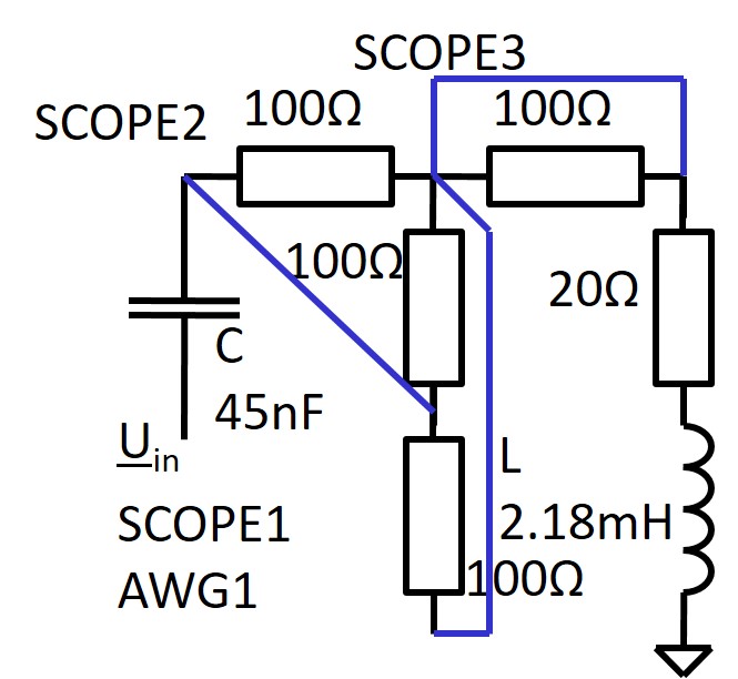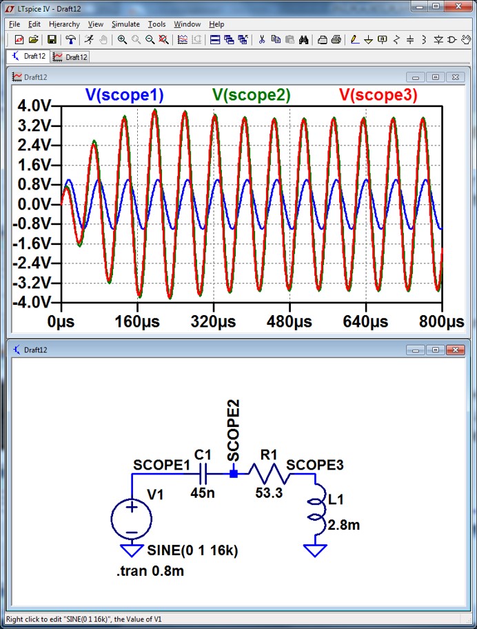 Serienschwingkreis Spule: Innenwiderstand 20 Ω C = 45 nF, R = 53.3 Ω, L = 2.18 mH Resonanzfrequenz \( f = \frac{1}{2 \pi \sqrt{C L } } = 16 kHz \) Spannungsüberhöhung \( K_U = \frac{1}{R} \sqrt{\frac{L}{C}} = 4.13 \) Wenn U = 1 V mit 16 kHz anliegt, so hat die Spannung am Kondensator den Wert 4.13 V |