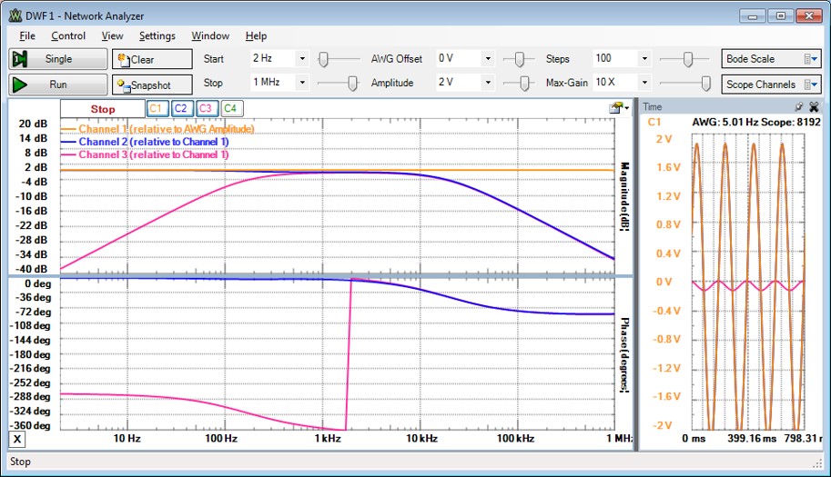 Die Übertragungsfunktion stellt das Maß in Dezibel (dB) und die Phase über der logarithmischer Frequenz dar.