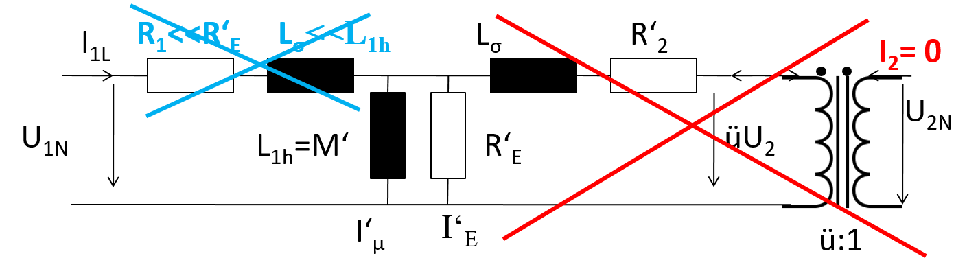 Im Leerlauf fliesst kein Strom, deshalb fallen die rot gekennzeichneten Elemente weg.