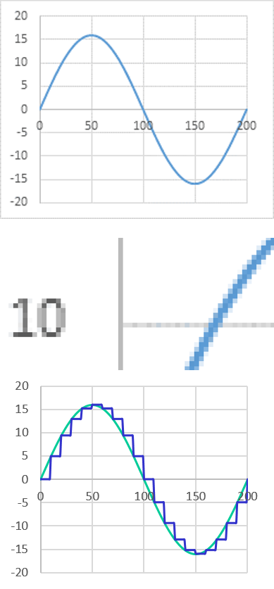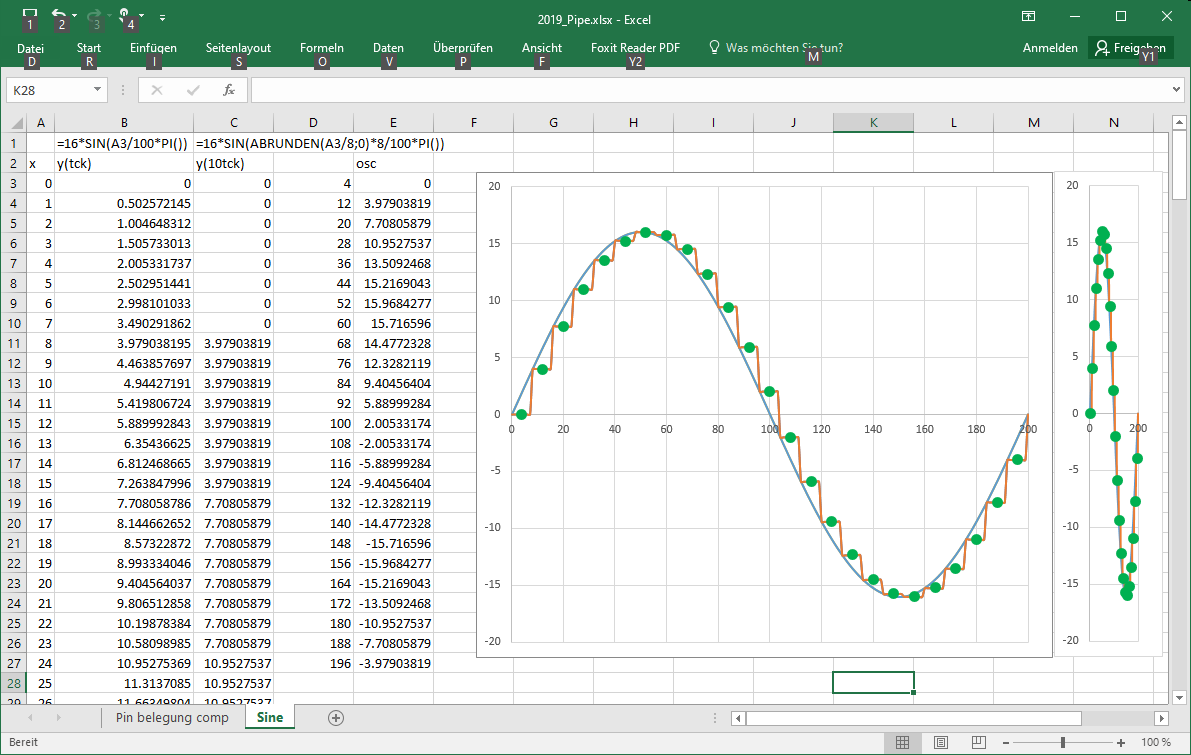 y, column B: = RUNDEN(511.5 + 511.5 * SIN(RUNDEN(A2 / 16;0) * 16/2048*11*2*PI());0)