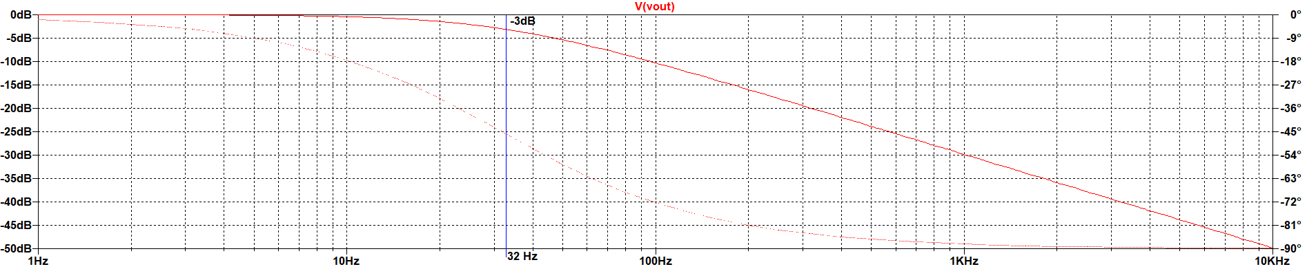 This analysis allow us to make the small signal analysis over the DC operating point. As inputs, the selection of the limits to the frequency sweep are available. In the result, it can be seen that the output is the bode plot for the circuit at the band defined in the analysis. For the specific circuit, the frequency edge is almost 32 Hz by the formula. It can be seen that this number is nearly the value of -3dB magnitude |