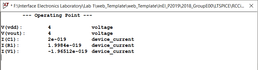 The result of this analysis is table of values, which correspond to the values of DC steady-state analysis, treating the capacitances as an open circuit. The values obtained are reasonable, in order that for the DC analysis, the voltage should be the same at the output. A value for the current was obtained, however it is too small that is practically considered to be zero. |