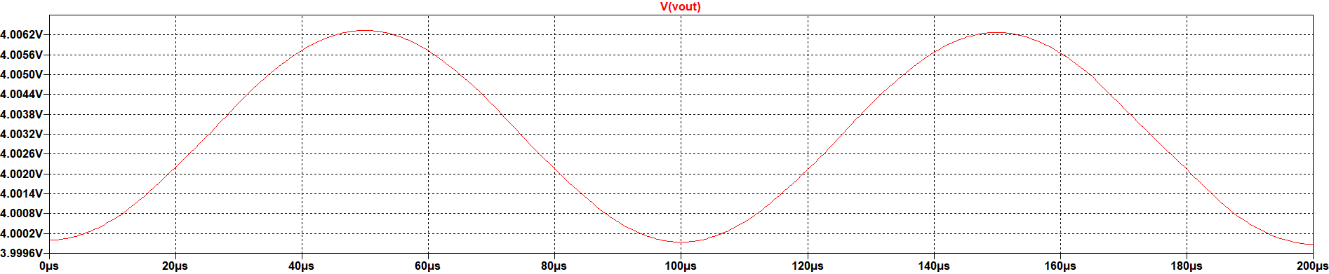 The result of this analysis is a graphic in which the behaviour of the circuit could be observed in the time domain. As the name of the analysis, with this option the transient behaviour of the circuir could be observed. As expected for the circuit, as the input is a sinusoidal wave, the output has the same property. Taking into account that this circuit is a low-pass filter, is reasonable that to a frequency of 10kHz the output is attenuated. This is beacuse the bandwidth of the filter is defined as: \( F_c = \frac{1}{2 \pi {R} {C}} = 31.8 {Hz} \) which is a value much lower than 10 kHz |