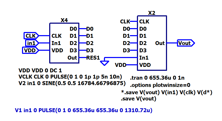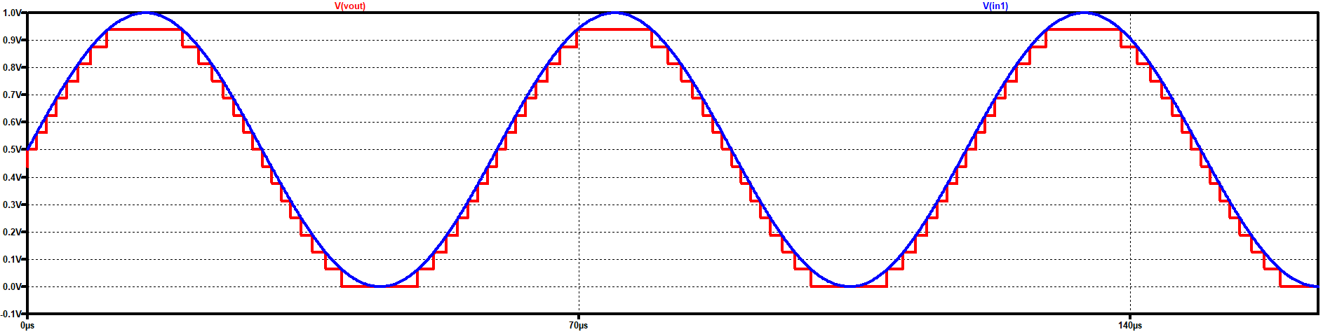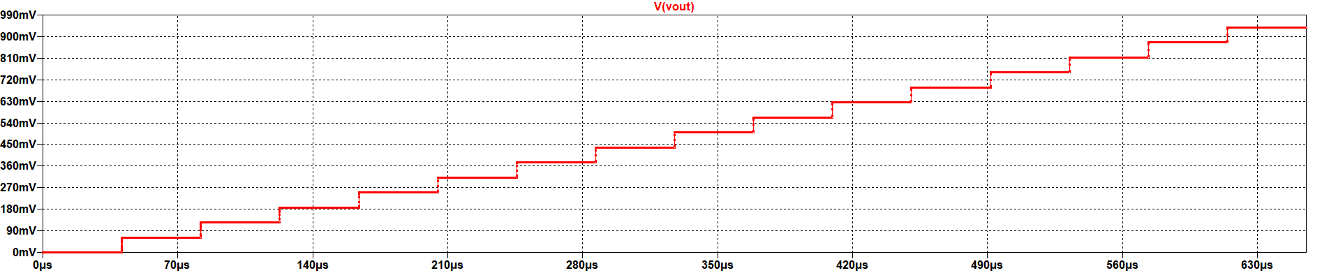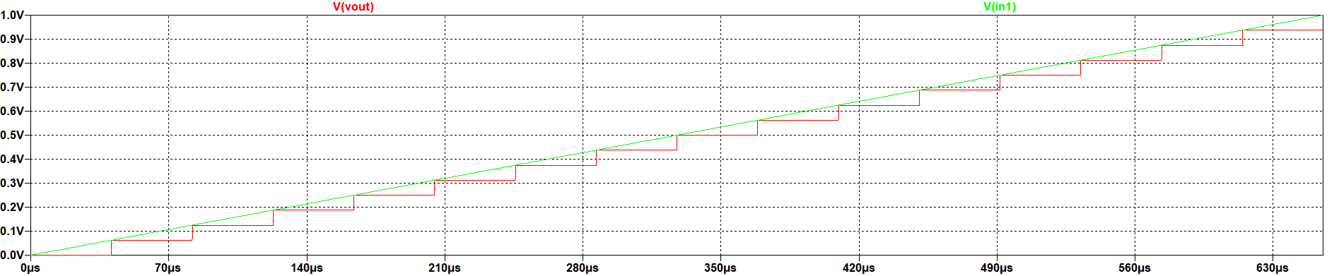The figure shows that the converter is following the form of the ramp wave, but with fixed steps as it is an output based on fixed values. As the converter is 4 bit, the steps are 16. The calculations are also valid for this signal: \( LSB = \frac{V_ref}{2^{N}} = 1/16 = 62.5{mV} \) and therefore, the maximum output voltage is: \( V_{out,max} = {LSB} \times ({2^{N}-1}) = 937{mV} \times 15 = 937{mV} \) |