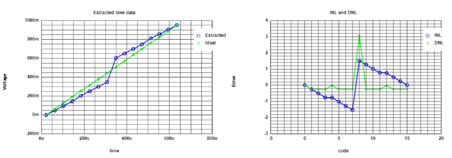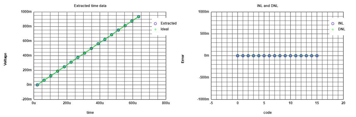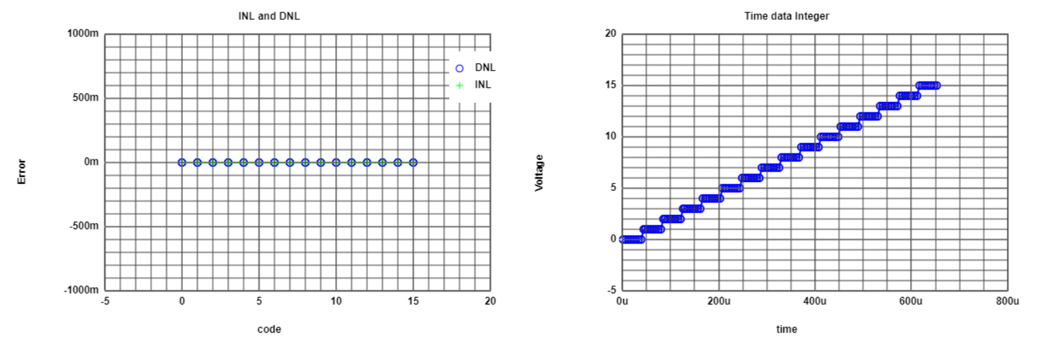 The figure shows the graphics of DAC - DNL and INL from the data of the simulation. Here there is no error between the real and expected values, and therefore the DNL and INL are zero for all codes. |