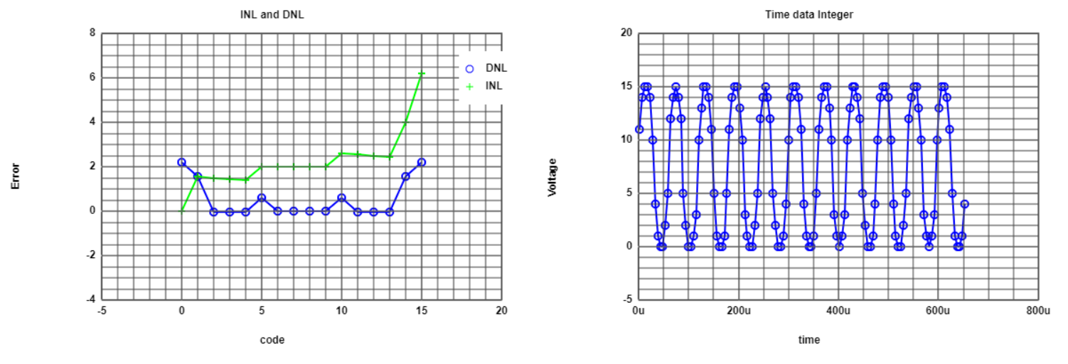 Following the instructions to build the schematic shown in the image, simulations were held from a sine and ramp input, in order to obtain data and measure the DNL and INL values |