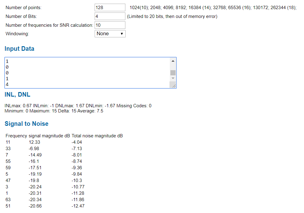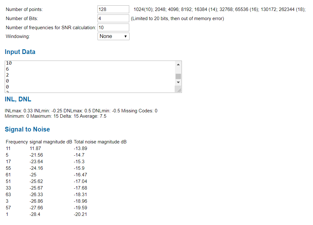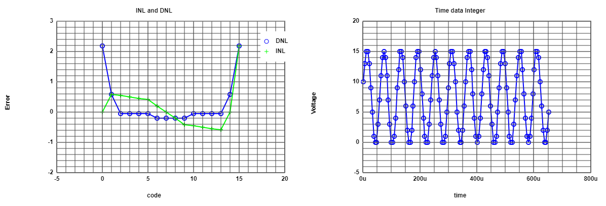 The figure shows the graphics of ADC - DNL and INL from the data of the simulation. That are the typical curves for DNL and INL for a sine wave using the histogram test. |
