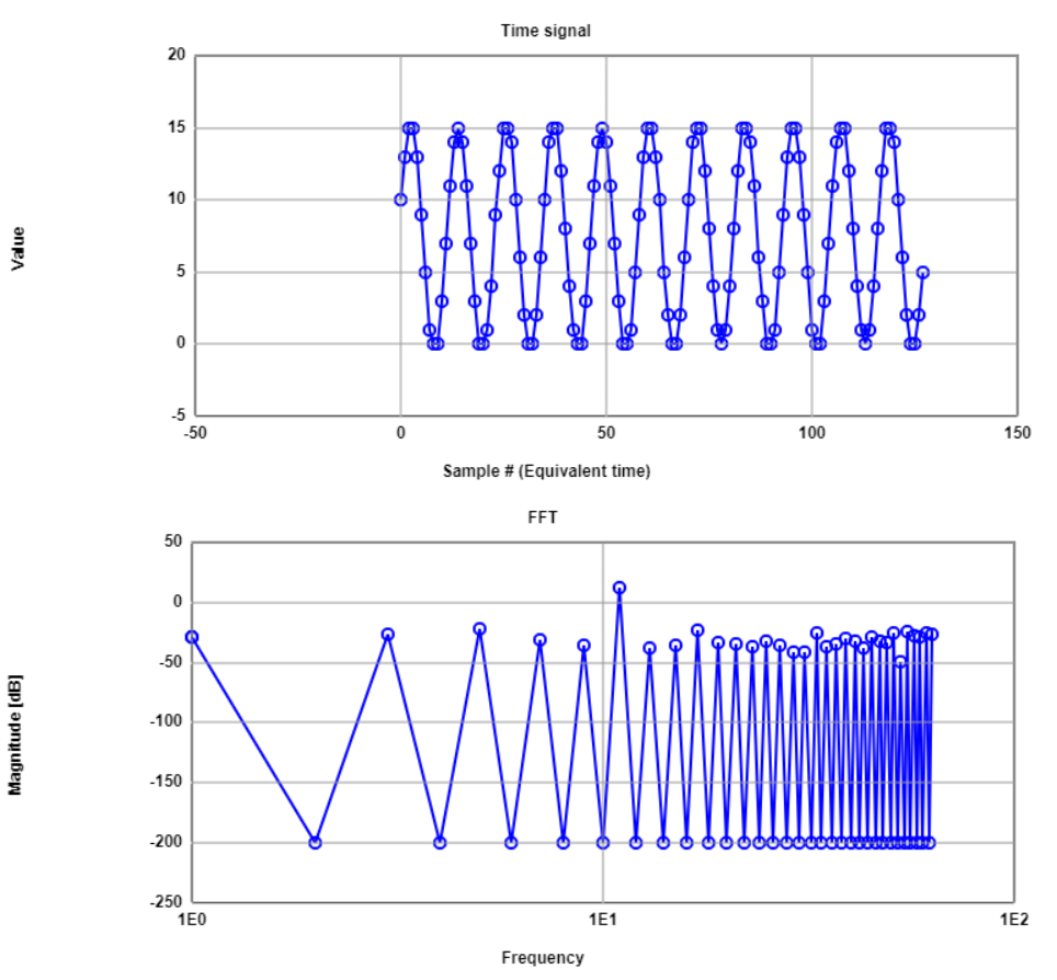 The figure shows the magnitude of the sine wave FFT components. The principal component is located at frequency 11, and from there there is a margin of 25dB. |