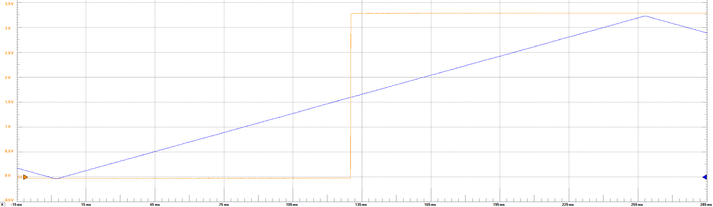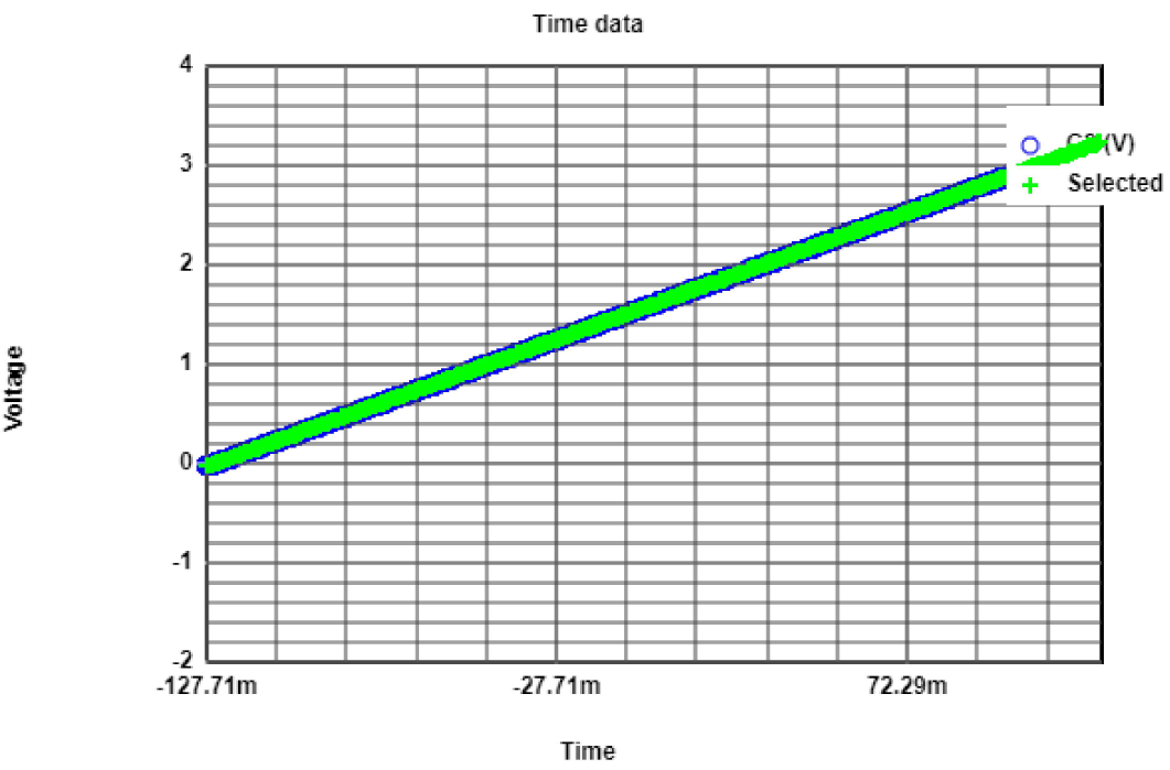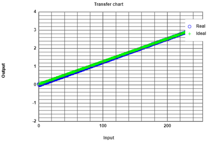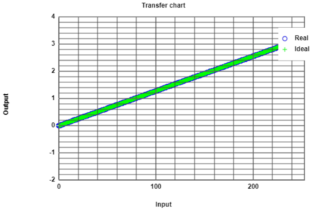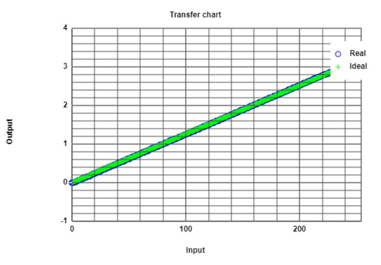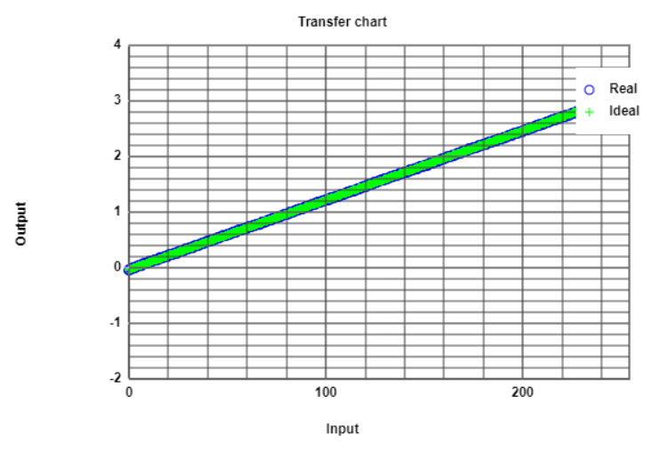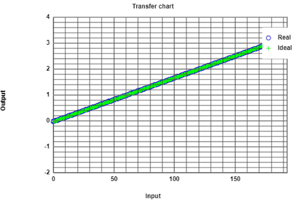 Aparently, the transfer chart give us the idea that the behaviour of the ramp is really close to the ideal ramp. However, the zoom area to the origin showed us that the data