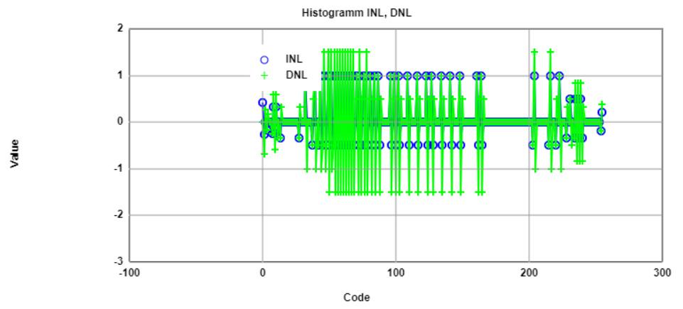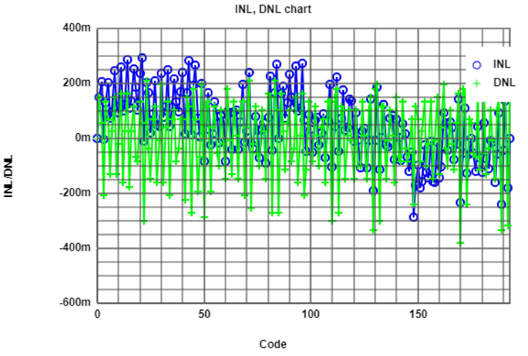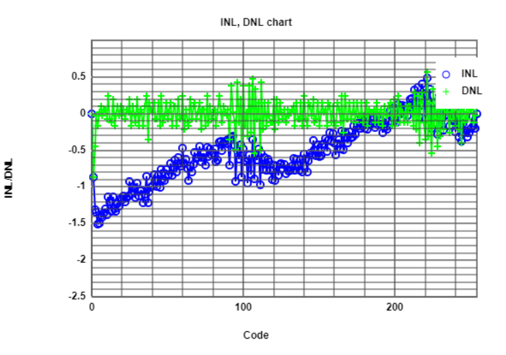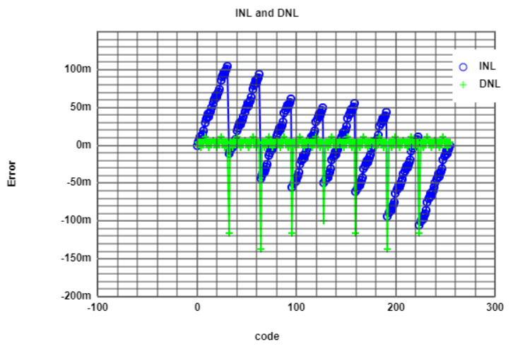 points were not so stable for low codes. Also, the INL indicated that at low codes there was a huge amount of error, and for codes grater than 150 the errors are not so big.