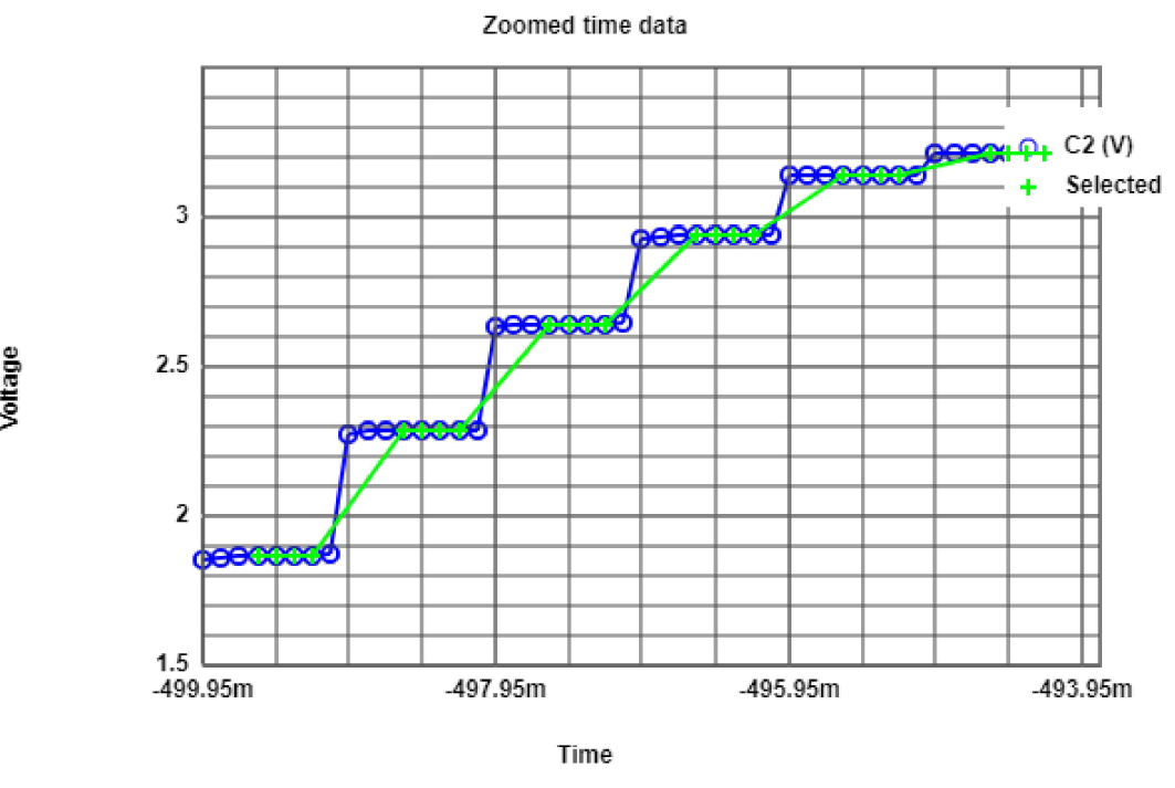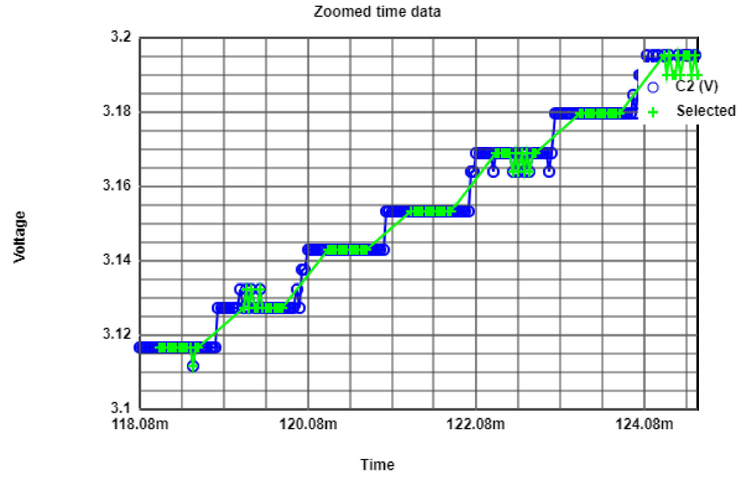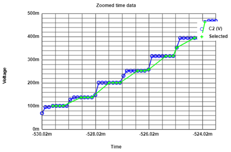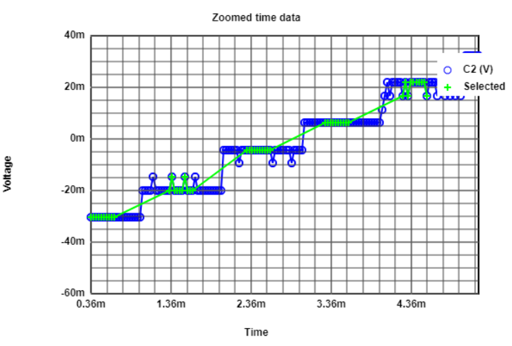 Now the INL and DNL have an acceptable range of error between +/-0.5 LSB, and the samples are better distributed into the steps. It can also be observed some noise over the