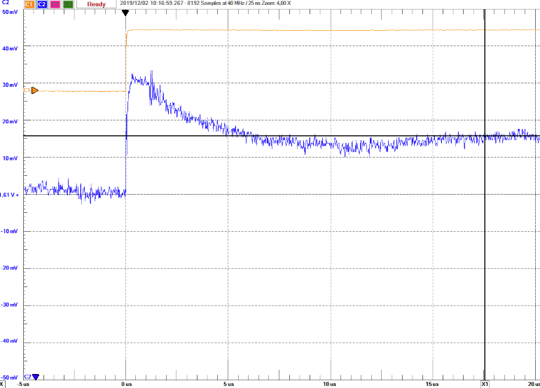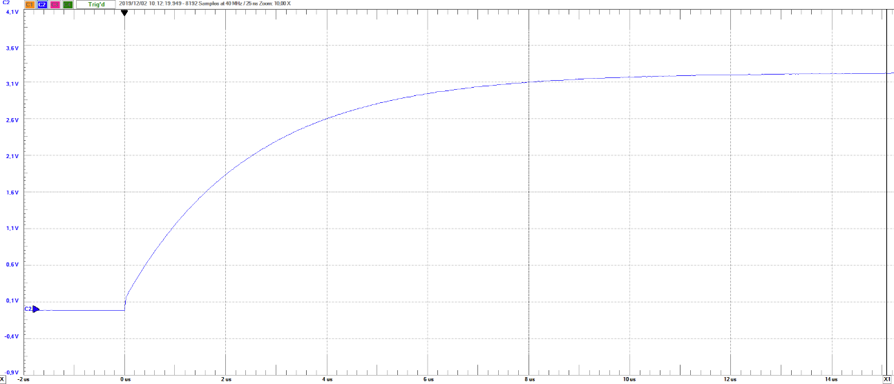 The results of this measurement are as follows: V_max = 3.235V; t_set_full = 15us; t_sett_mid = 17.5us.